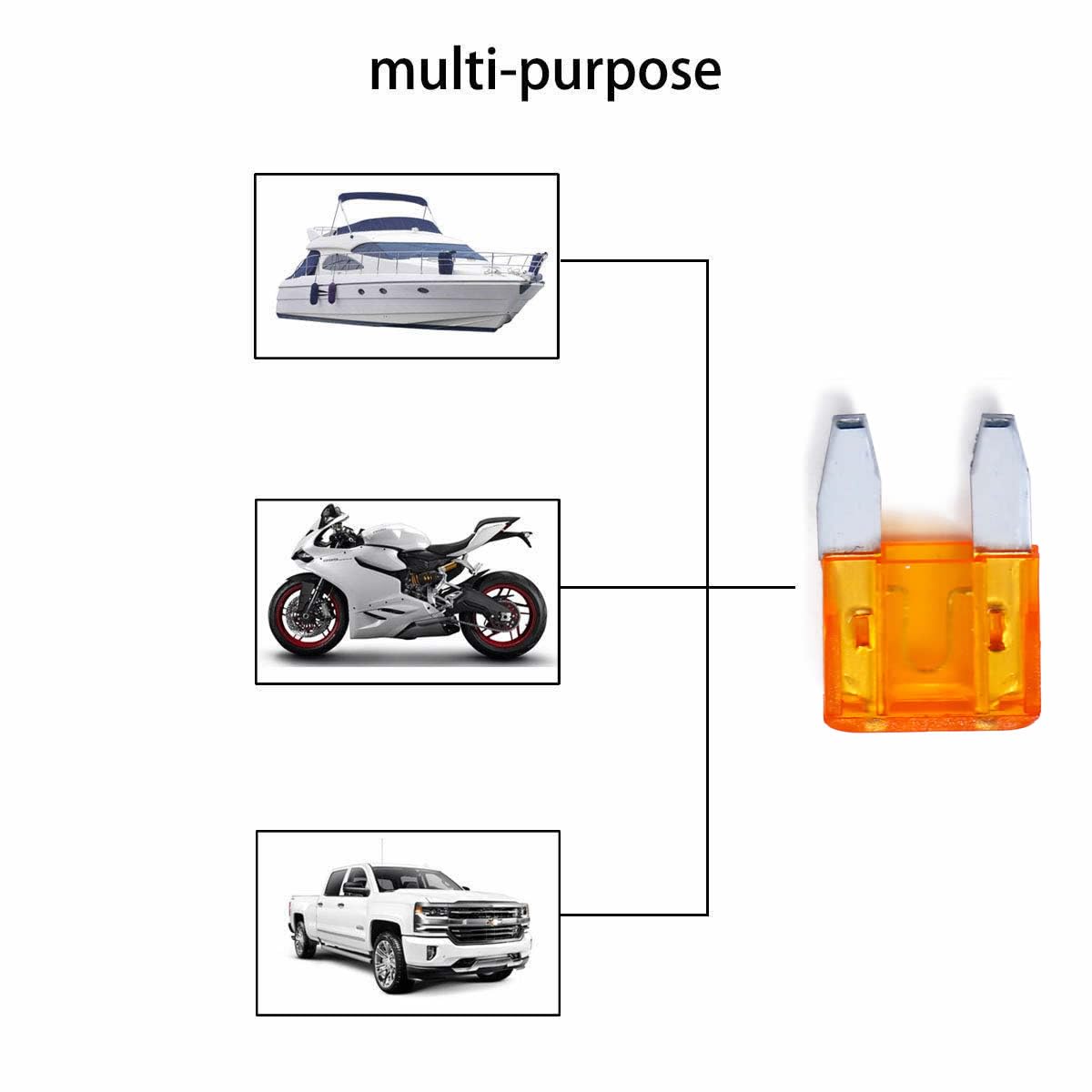 - WIDELY USE - These assorted fuses are specifically designed for Cars, Trucks, SUVs, ATVs, UTVs, Camper RV, Motorcycles, Fleet, Golf Car, Boat, snowmobiles, and most general DC applications etc., covering such components as radio, light, turn signals, etc.