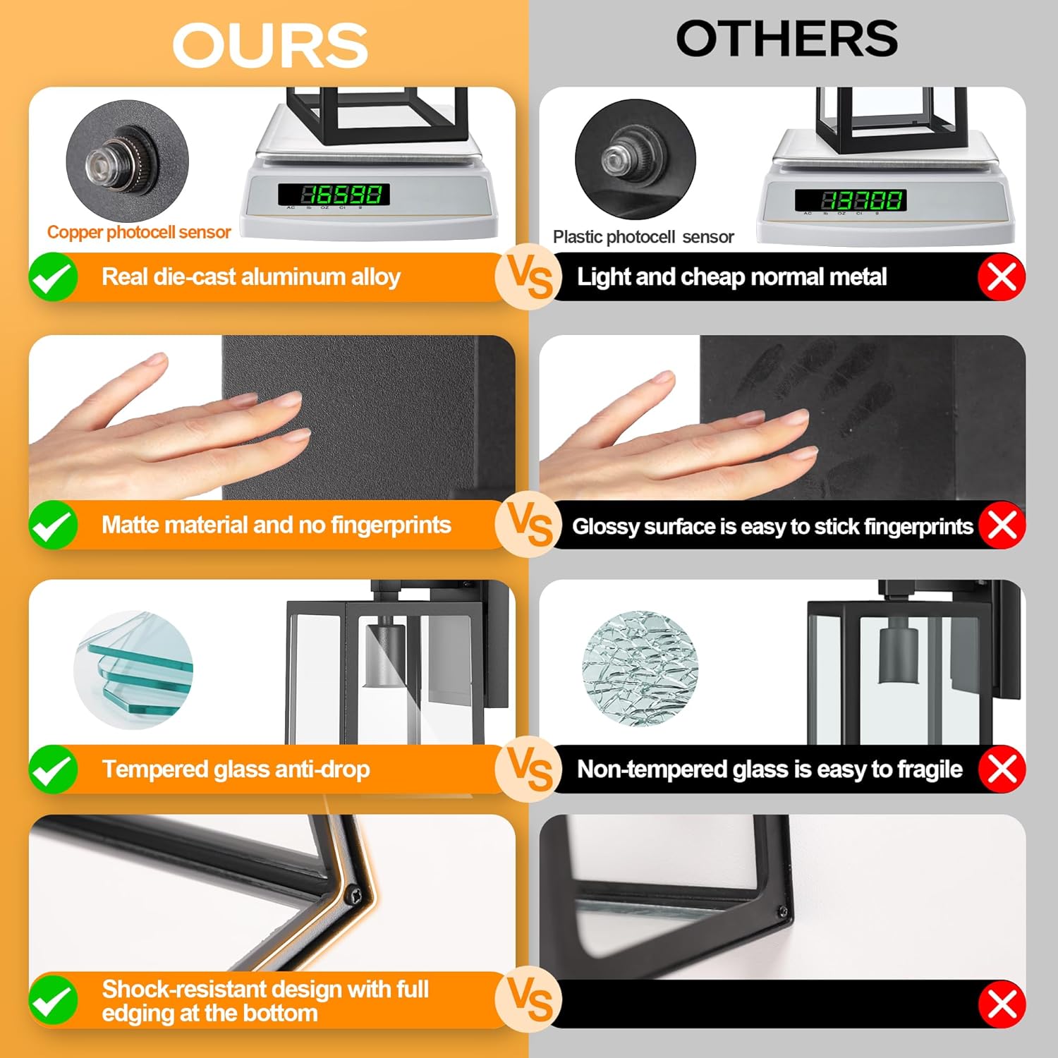 - šćTop-notch Photocell Sensor TechnologyćTake the upgraded photocell sensor, our outdoor wall light fixtures can sensitively detect the brightness of the surroundings to adjust the switch. Auto turn on at night time when ambient brightness less than 20 LUX, auto turn off at daytime when brightness over 100 LUX. You don't need to turn it on/off manually, free your hands, and save your bills on electricity.