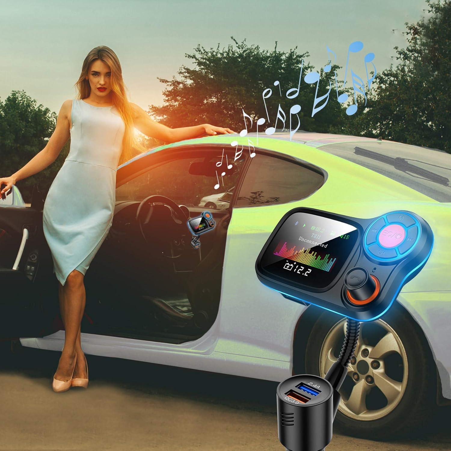 - UNIQUE BLU-RAY &1.8" DISPLAY & FLEXIBLE GOOSENECK: The car Bluetooth adapter larger and clearer color display, featuring an LED color screen that shows music mode, FM channel, car battery voltage, volume, with a Blue color LED backlit that can offer visual enjoyment; a 360-degree flexible gooseneck to offer a more comfortable visual interface.