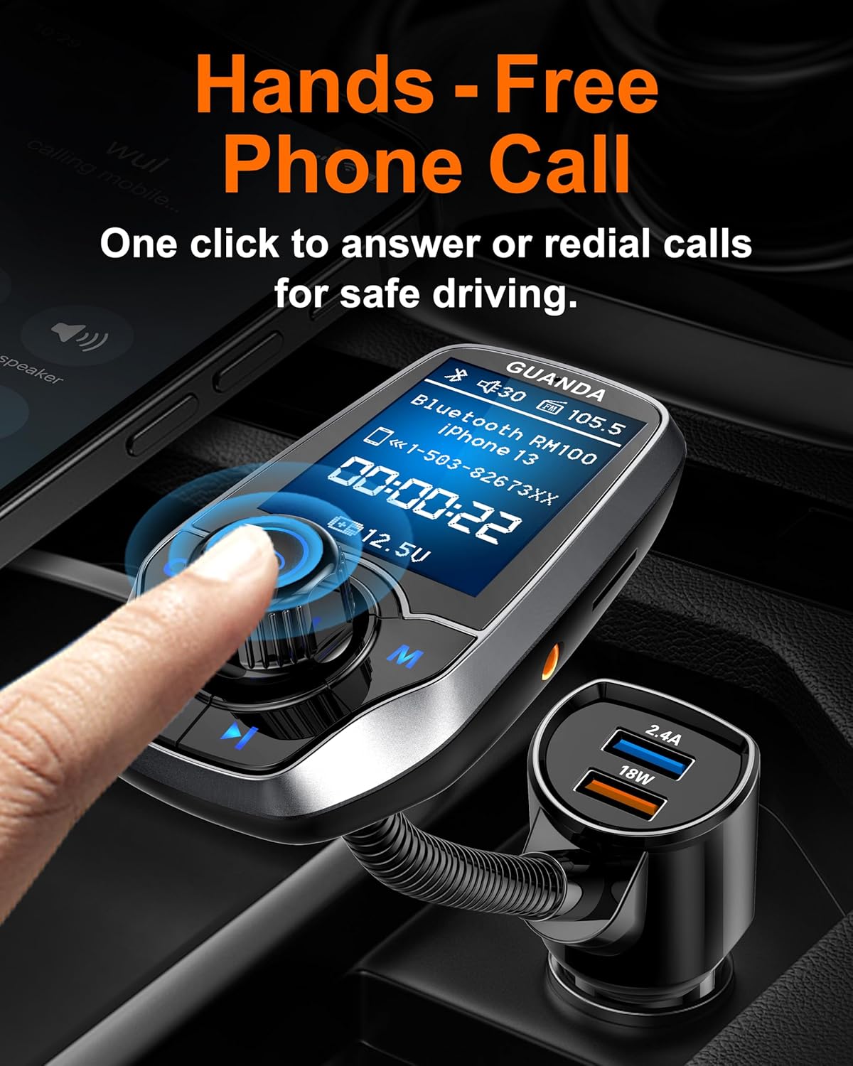 - ADVANCED 1.8" DIGITAL COLORFUL LCD DISPLAY: Via Our Bluetooth FM transmitters for car, more indicators can be clearly seen, such as Bluetooth name, FM stations, connected device's name, car voltage, music name, music amount, colorful and lively music spectrum, play status, volume etc. Meanwhile, car radio adapter Bluetooth transmitter adopts rotated 360-degree flexible elegant gooseneck design.