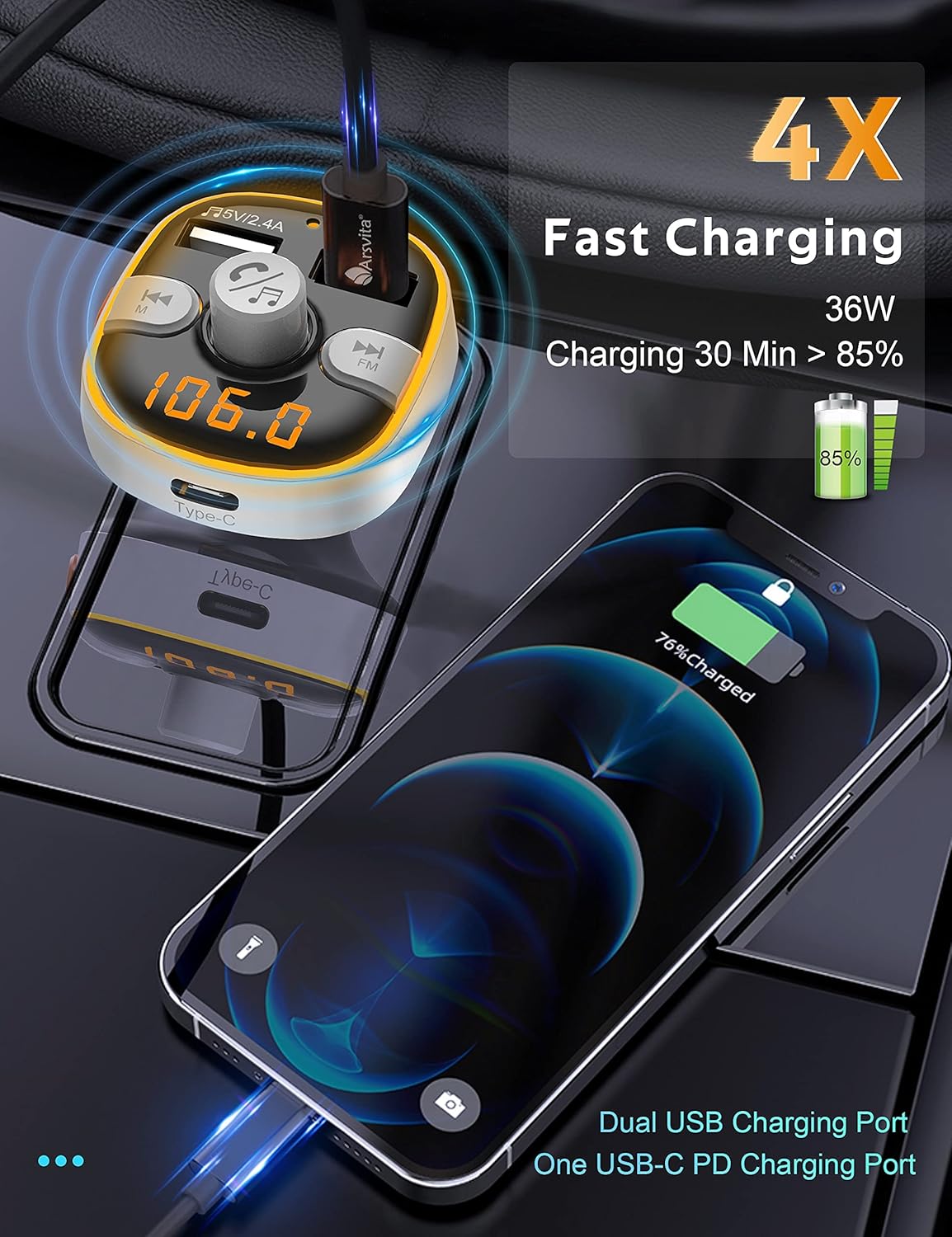 Arsvita Bluetooth FM Transmitter for Car, Radio Receiver/Audio Adapter with Type-C PD Charger, Support QC3.0 Quick Charging, Hands-Free Calling and Hi-Fi Sound Playback, Silver