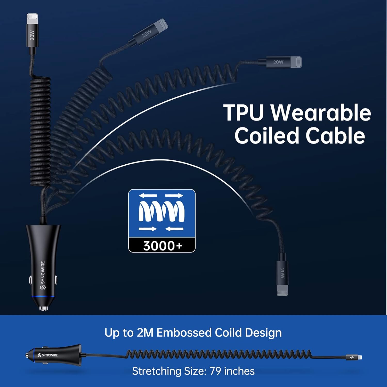 - [BUILT-IN 6.5FT LIGHTNING COILED CABLE] Compared with other nylon cable, Syncwire makes innovation. TPU coiled cable is more durable and more flexibility, and it can extend to 2M which could satisfy the basic charging needs in car. The most important one is the built-in coiled cable makes the car more clean and tidy.