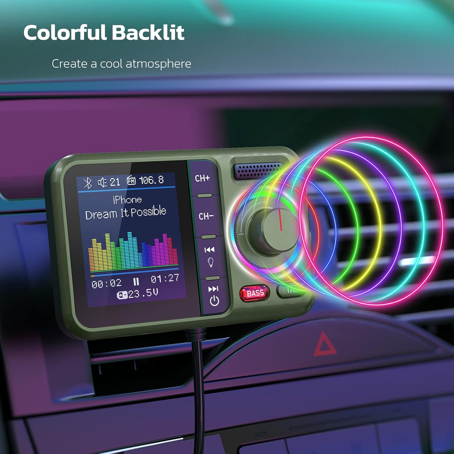 - Big Color Screen & Air Vent Clip: Our new car bluetooth adapter adopts a big color screen for more information and better visual experience. Now you can read more information such as incoming phone numbers, car battery voltage, FM frequency, track name, etc. In addition, the air vent installation offer you better view angle for your safety.