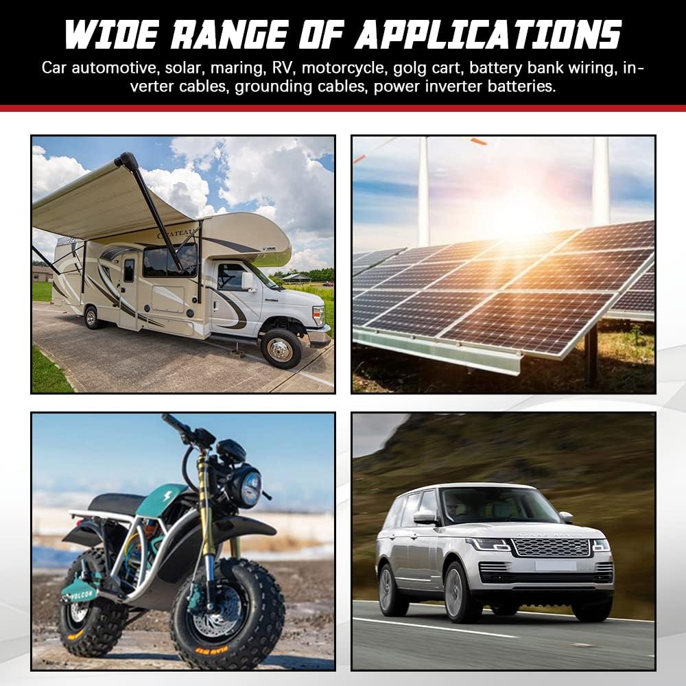 - 【Wide Application】Our positive and negative cables are widely used for car automotive, solar, marine, RV, motorcycle, golf cart, lawn/garden equipment or power inverter batteries, also used for electrical equipment.