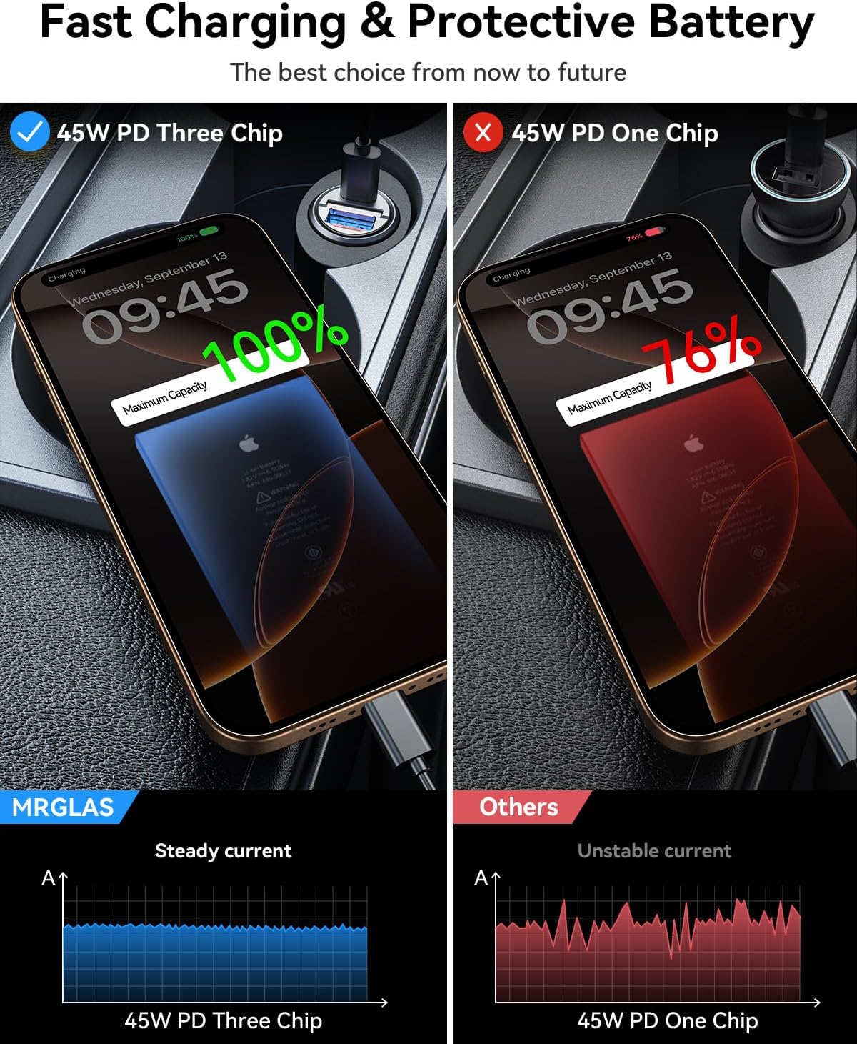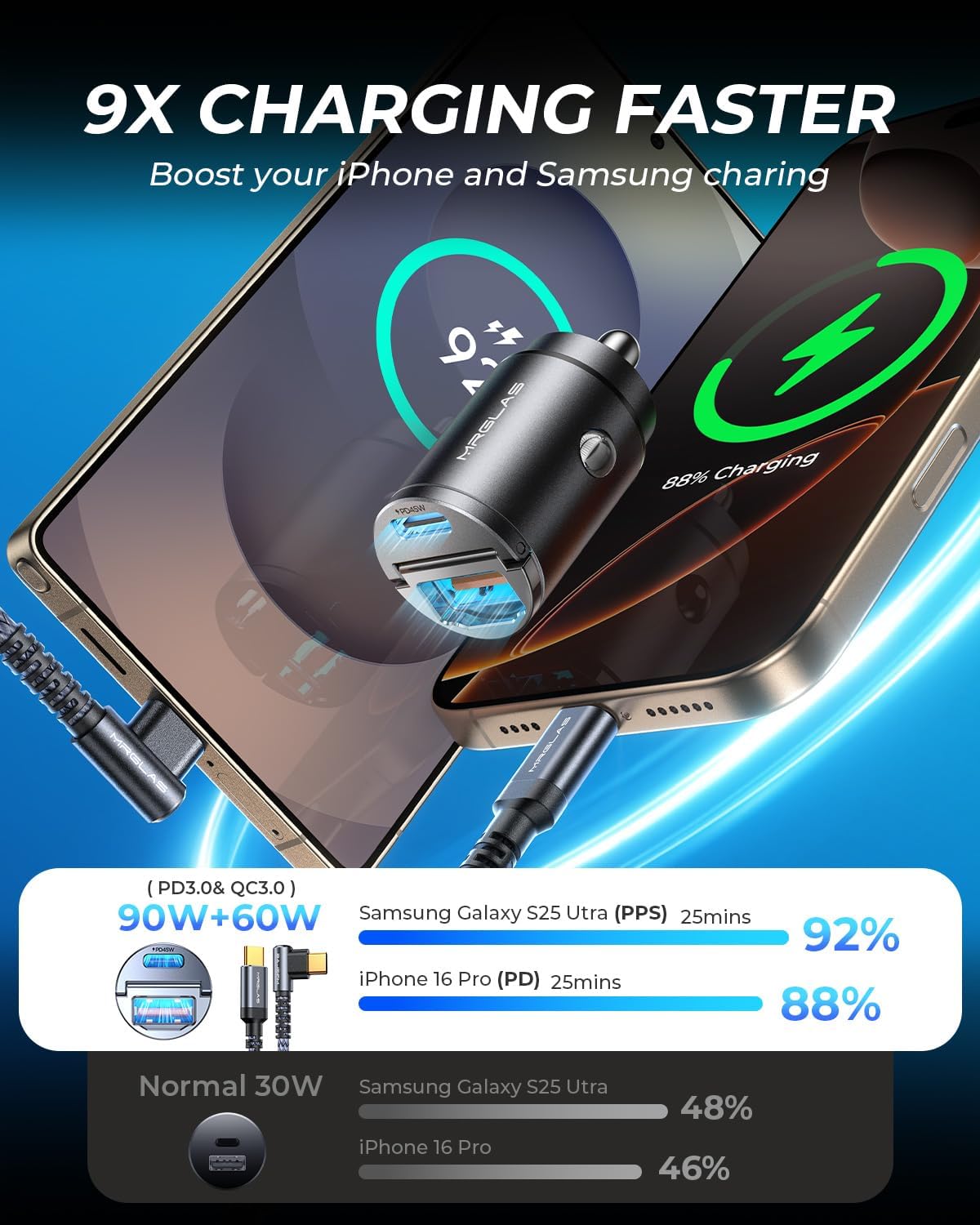 - PD45W+QC45W SUPER FAST CHARGING: MRGLAS 90W car charger adapter fast charging supports PD 45W (USB-C port) and QC 45W (USB-A port) high output, which can fast charge all major mobile phones/tablets at the same time. Allowing iPhone 16 Pro Max and Samsung Galaxy S25 to charge from 0% to 89% in 30 minutes, it helps you save more time on long trips