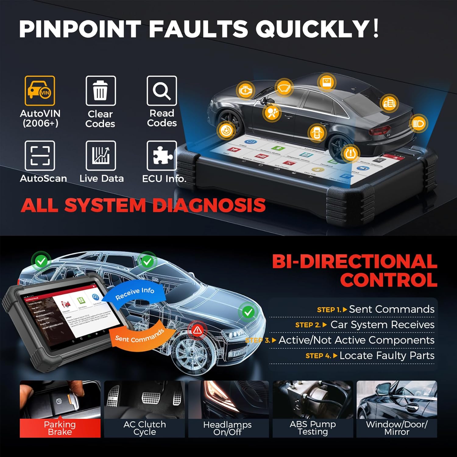 - [All System Scan + Active Test] This bi-directional scan tool gets an insight into all accessible system such as PCM/ECM/EPS/PDM/BCM/TPM/SCCM/RADIO etc., to read, clear 99% generic & manufacturer DTCs, obtain ECU info, and display graphic live data. It is also a bidirectional scan tool, can send commands to ECU and receive a response like turn on/off radiator fan, lights, sound horn, etc. to quickly locate faulty auto parts. This is very helpful to smooth your workflow.