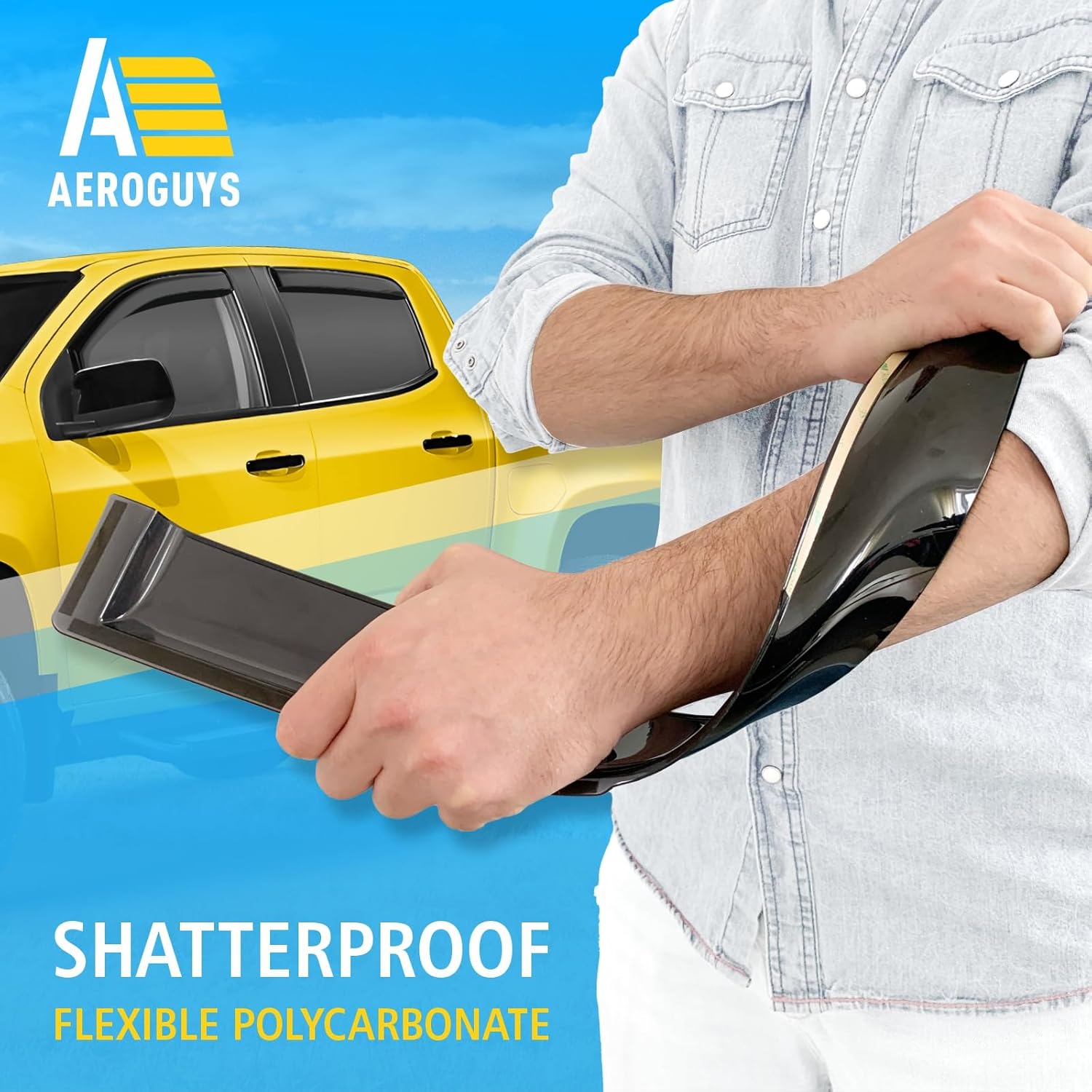 - No Tools Needed, Quick and Easy Assembly β These rain guards are very easy to fit. IN-CHANNEL INSTALLATION provides perfect fit for your truck. Just slip it onto your truckβs window and your job is done within minutes. There is no drilling or no tools required. Be sure that AEROGUYS window deflectors are water resistant, sun protective and will not bend, break or crack regardless of the weather conditions.