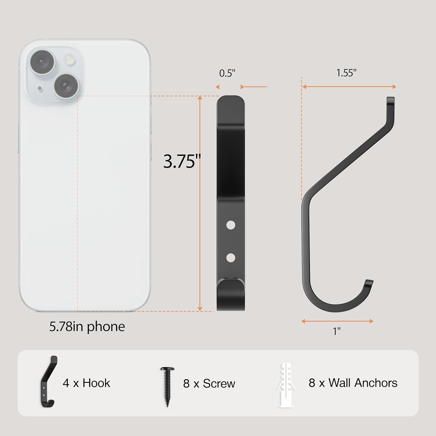 10-Pack Coat Hook for Hanging, 20LB (Max), Stainless Wall Hooks for Towel, Hat, Backpack, Key, Clothes, Wall Mounted Coat Hanger for Closet, Metal, Black, 3.75"