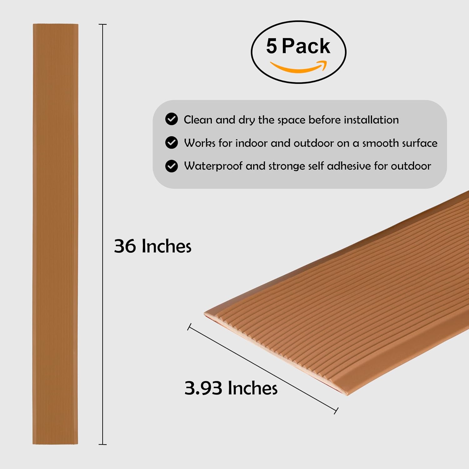 Rubber Bond 4x36in Anti Slip Stair Treads (5-Pack) - Waterproof Outdoor/Indoor Heavy Duty Non-Skid Tape for Stairs - Adhesive Rubber Grip Strips for Steps & Ramps - Brown