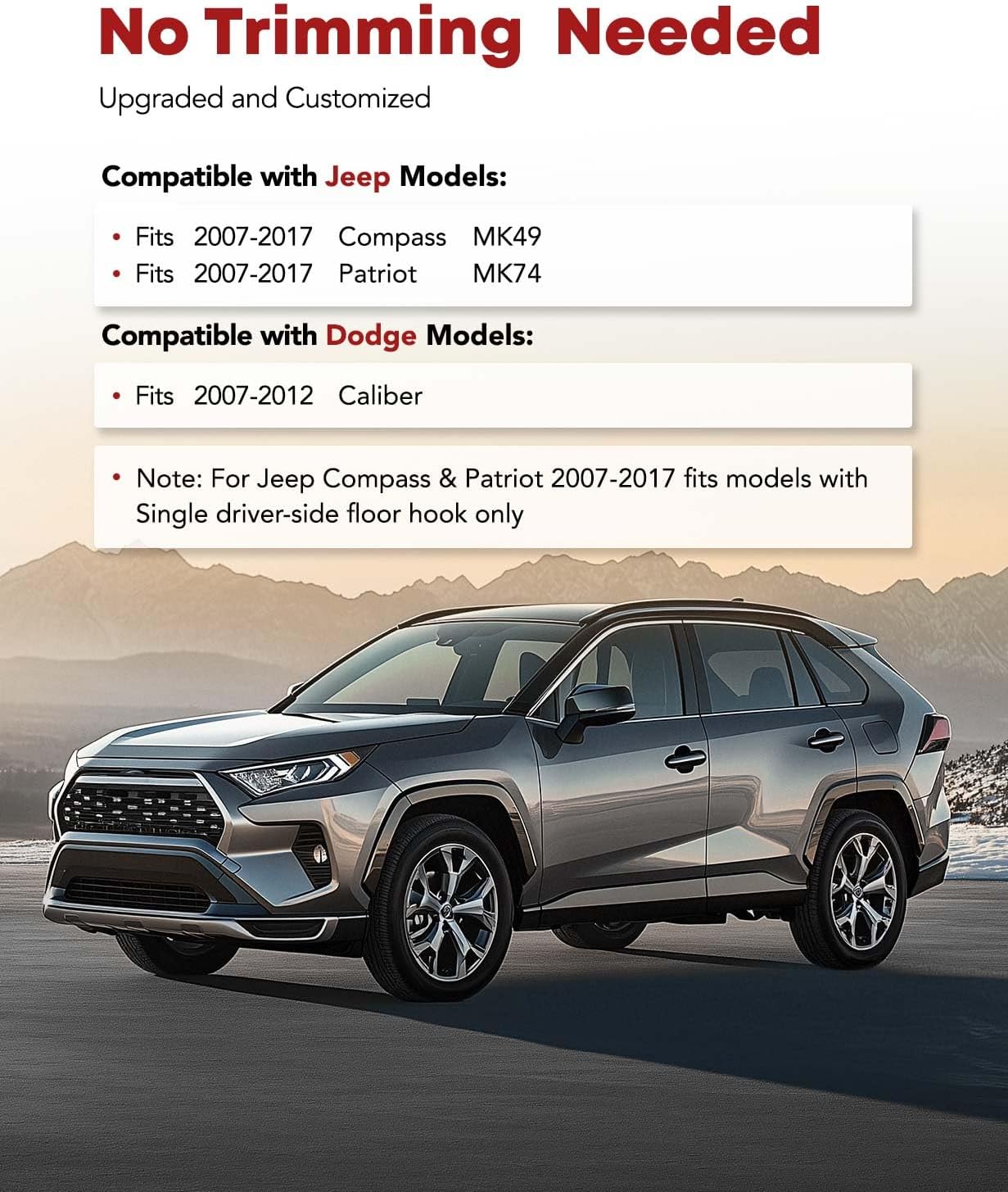 - Custom Fit: Compatible with Jeep Compass/Patriot 2007-2017 (Fits models with Single driver-side floor hook only) ; Compatible with Dodge Caliber 2007-2012; all weather floor mats, it provides a perfect fit and enhances the overall look of the cars interior. Great fit right out of the box