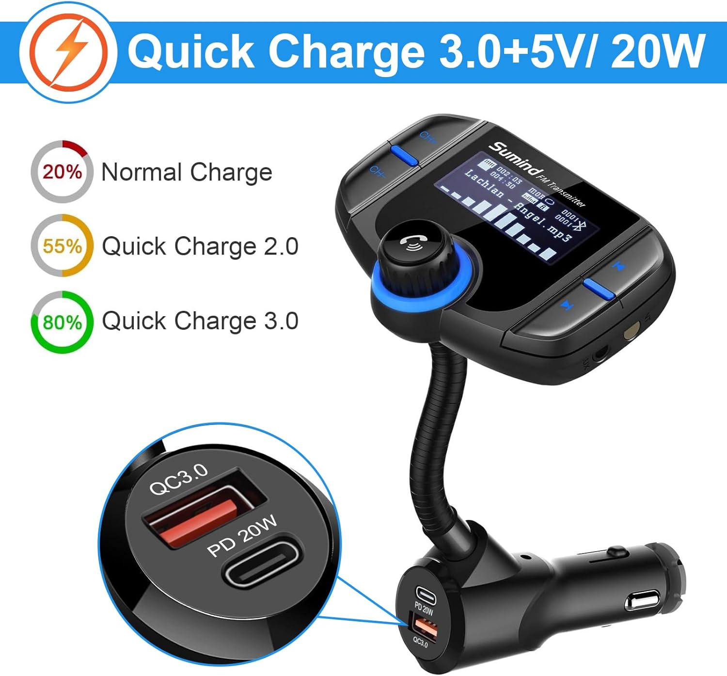 - Special Design: large key for easy operation; 1.7 Inch large LCD backlight display song name/ incoming phone number and shows your car's battery level when car start; Can rotate the LCD display screen in 270 degree gooseneck for optimal viewing comfort; Turn off the FM transmitter: long pressing the next song key for 5 seconds, it will turn off the FM and functions keep charging function