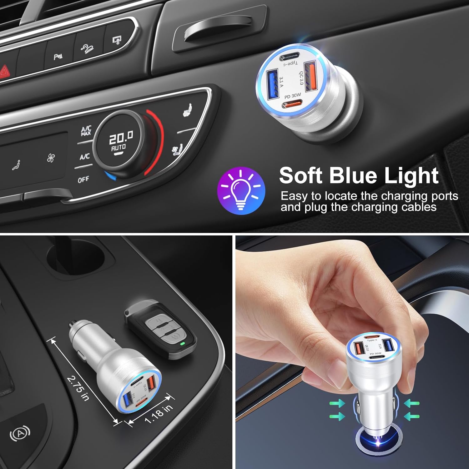 - [12V to USB C & USB A Car Charger] 4-in-1 Car Charger designed with 2 USB-C and 2 USB-A charging ports, enable you to charge multiple devices at the same time. The USB-C PD 30w port can fast charge the high speed needed device, like iPhone 15 Pro Max,Pad,Galaxy S24Ultra even MacBook. The USB-A QC Port can rapid charge most android devices from 0% to 80% in 35 minutes.