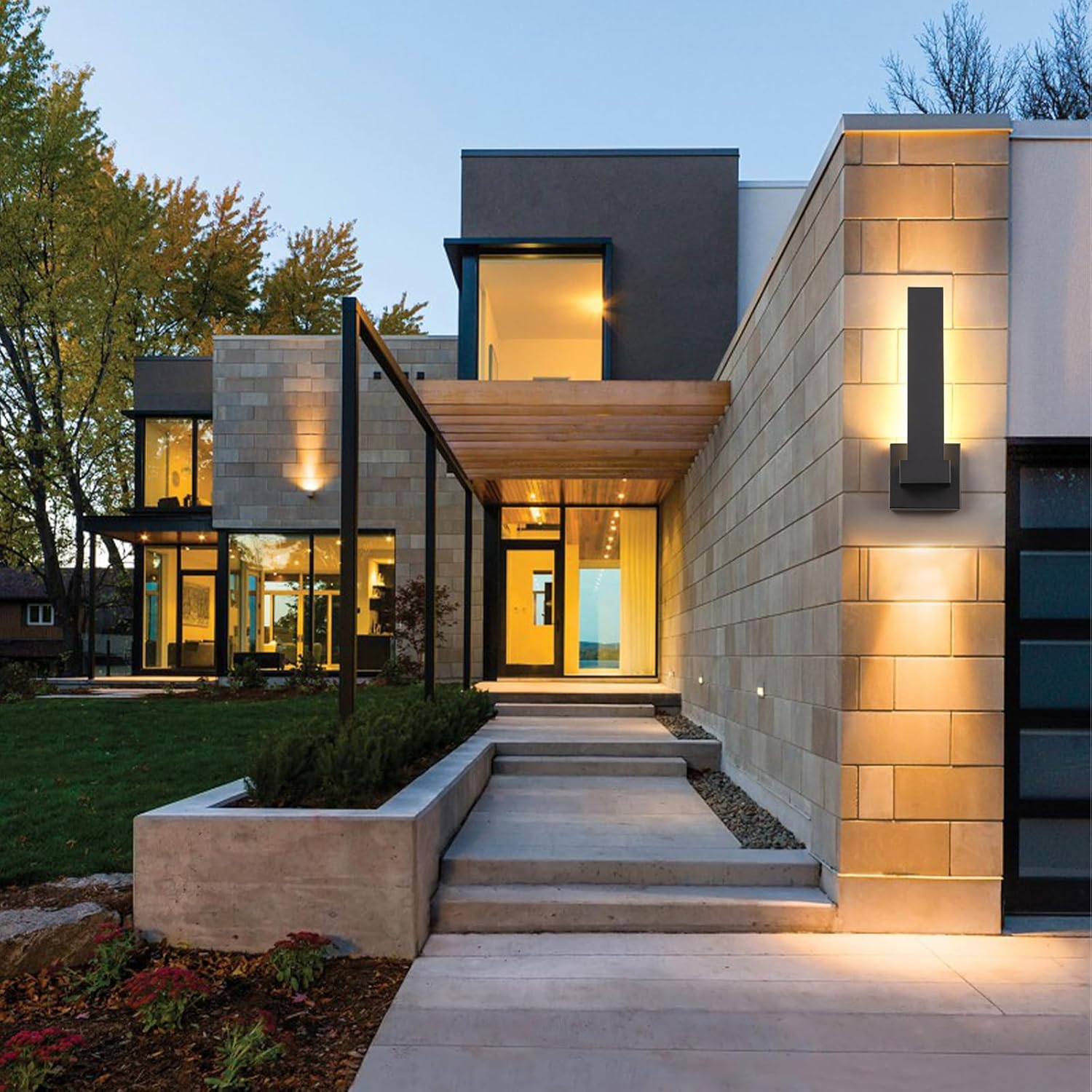 - Stylish and Minimalist Design: The black outdoor wall sconce projects light upwards through a rectangular design.16W,3000K Warm and comfortable light color provides a soft and bright light, which enhances the modern feel of the building and creates a warm atmosphere, while avoiding light interference to neighbors.