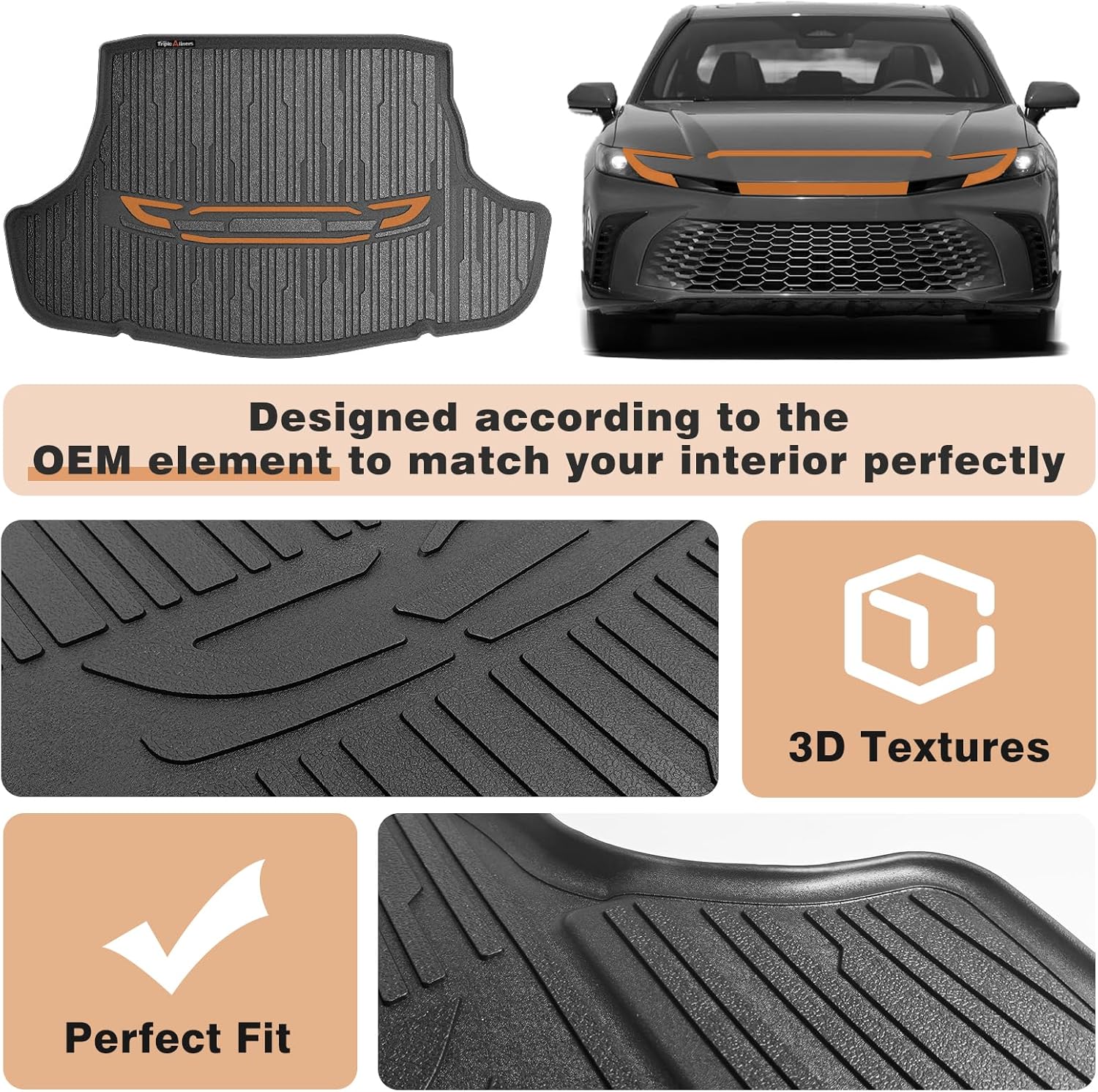 - Function & Why Us: Protect your car with full coverage, keeping a clean look and OEM style. 3D texture and anti-slip surface design ensure a flush fit and perfect stability. TripleAliner's mats feature reinforced edges for long-lasting performance