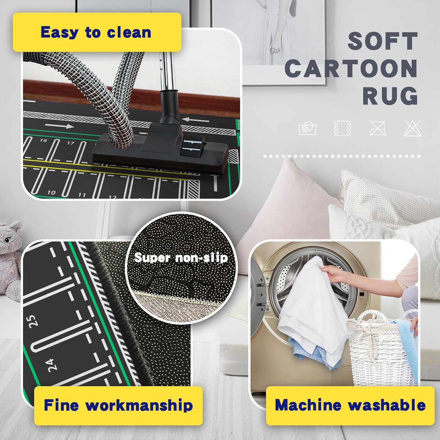 - Safe Material:This pattern is our original design.Kids car rug is 100% Polyester pile surface with non-slip latex Backing. Non-toxic, Non-BPA, and lead-free durable ABS plastic.