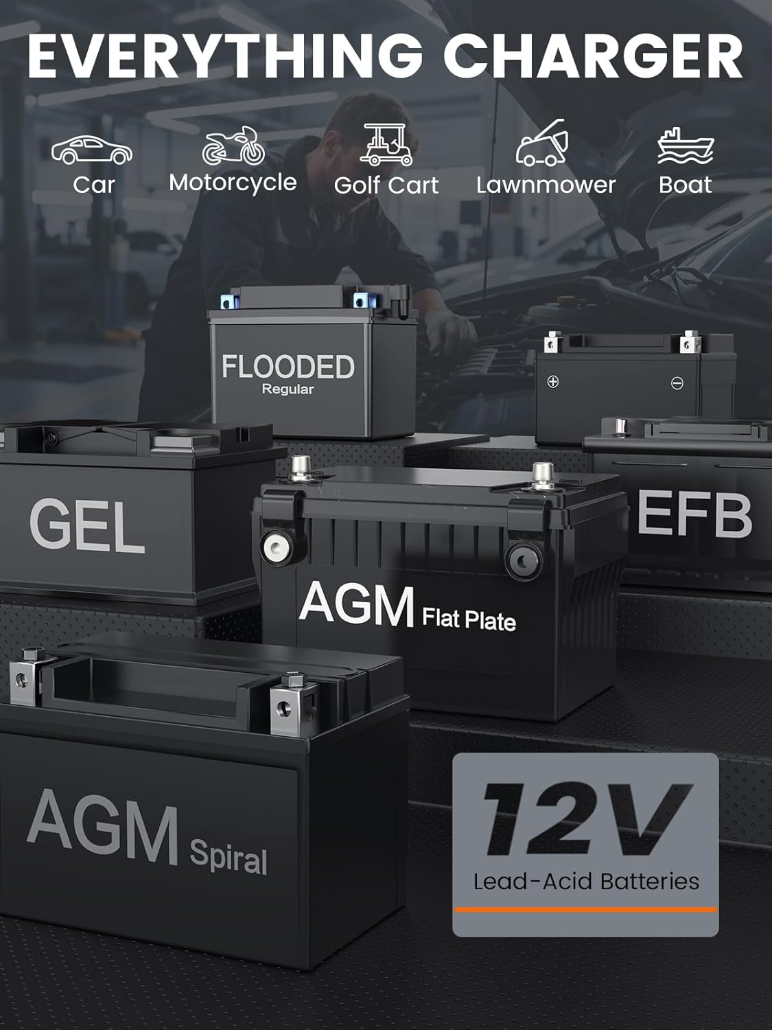 - COMPATIBILITY: Designed for ALL 12V lead-acid batteries: AGM, GEL, SLA, Flooded, Deep Cycle, Marine and so on. Supports cars, motorcycles, boats, ATVs, SUVs, RVs, trailers, lawnmowers, mopeds, classic cars, and more. Whether you're testing or charging—it’s the one tool for every job