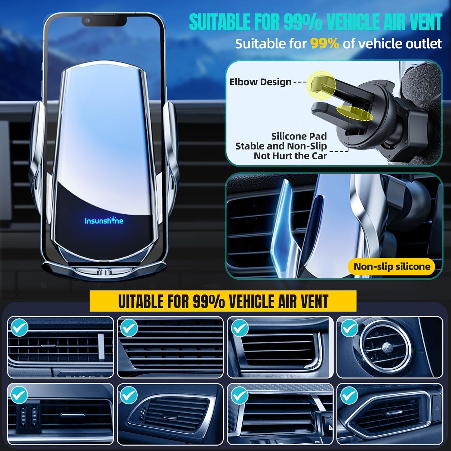 - ă15W QI Fast Wireless Car ChargerăUpgraded wireless charging with 15W stable and efficient. Meets international QI certification standards for QI-enabled smartphones, and requires QC3.0 car charger adapter (not included) to have fast charging mode with insunshine car phone holer