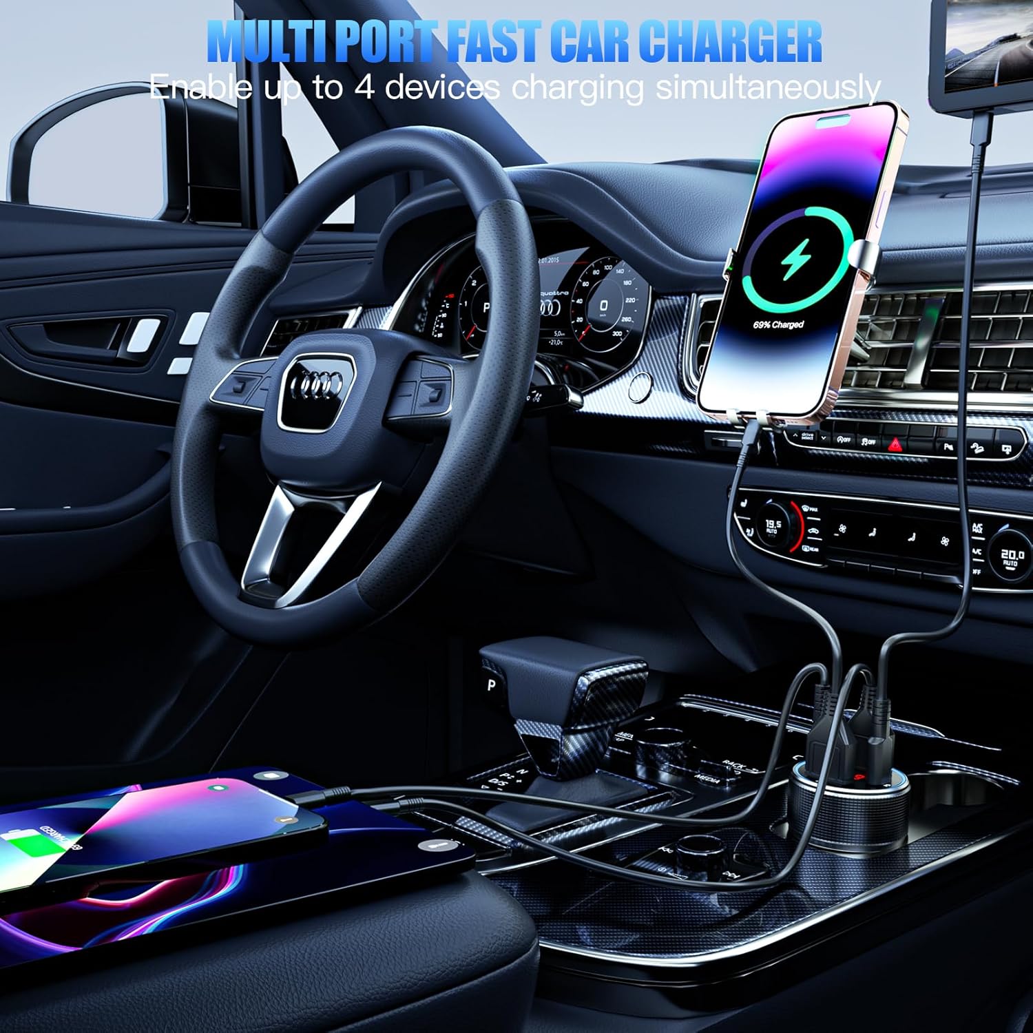- Multi-port Fast Car Charger : Car Charger is a versatile USB C car charger that comes with two USB-C ports and two USB-A ports, designed to rapidly charge a variety of USB-C and USB-A devices at the same time. This car cigarette lighter adapter is the perfect travel companion for all your smartphones, tablets, and all USB devices.