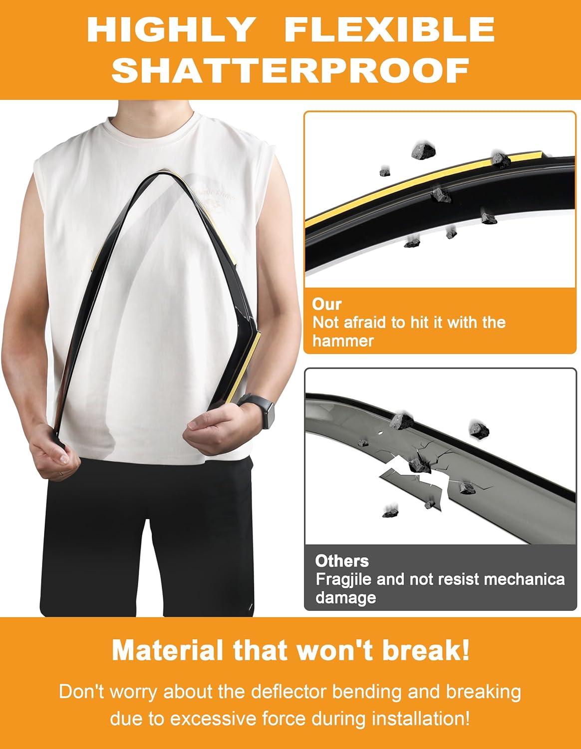 - ăExtra-Durable PolycarbonateăDeejecsun Window Deflectors made of long-lasting shatterproof material, offer ultimate protection against heat, wind, rain, and environmental damage, ensuring a safe and comfortable journey.