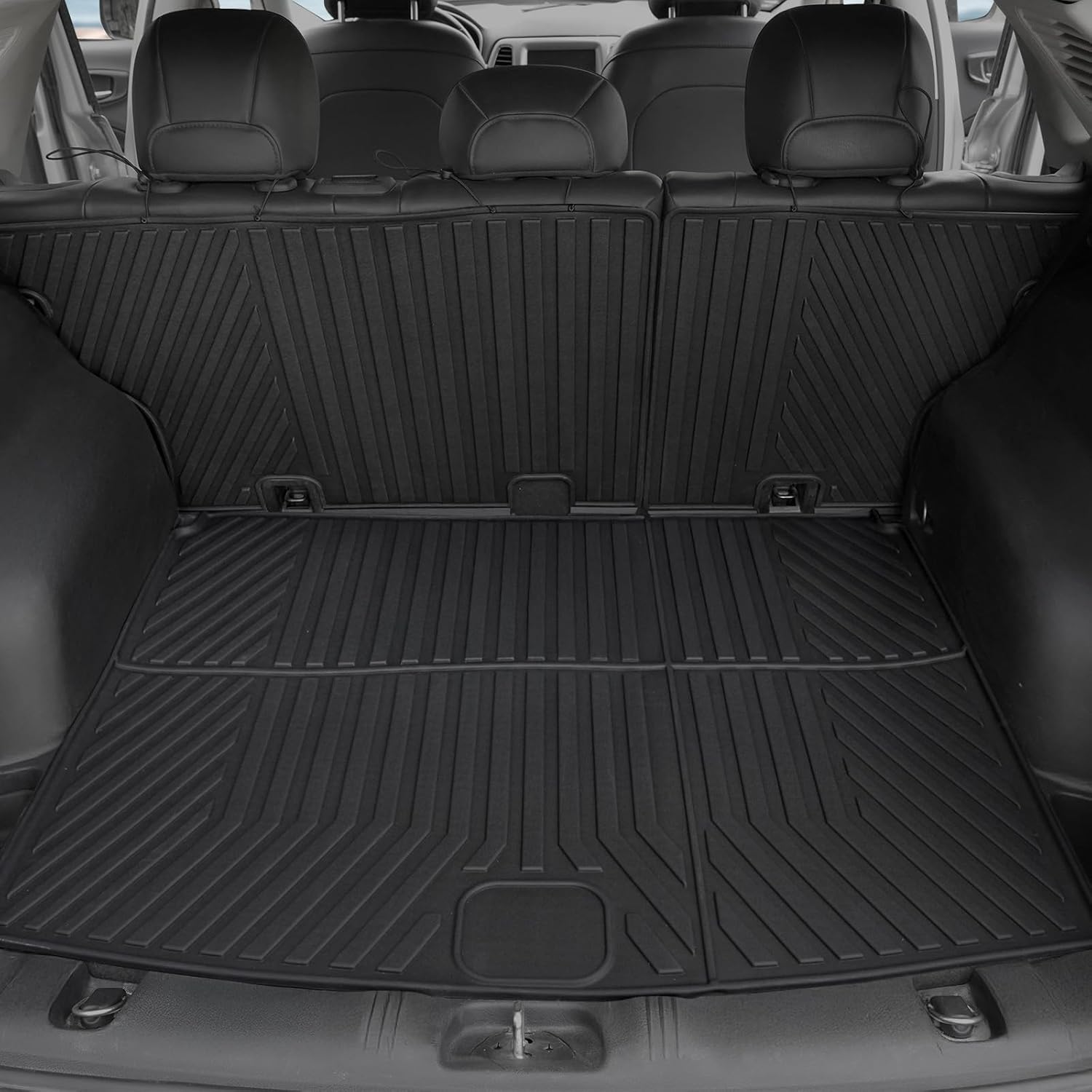 - Custom Fitment: Precisely designed with 3D laser scanning technology for 2017-2025 Jeep Compass Accessories(New Body Style 2nd Generation). Includes 1st & 2nd row floor mats, upper deck cargo liner, seat back protectors and 4PCs door sill guards – 30% more components than standard sets