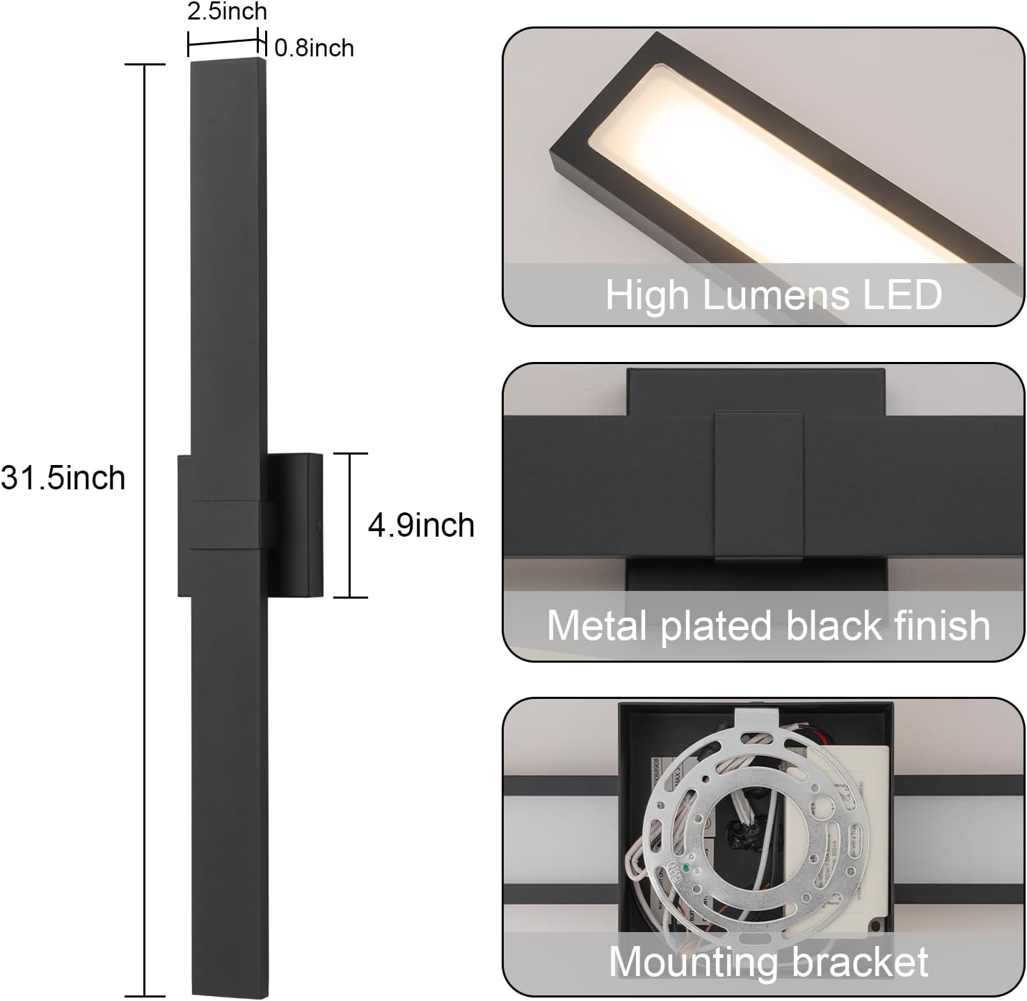 - MATERIAL AND SIZE: Black outdoor sconce lights is made of high quality modern metal, high technology LED bulb with soft light to take care of your eye health; Light source pole: 31.5(L)*2.6(D)*0.8inch(H), base fixing device: 4.9(L)*4.9(D)*1.37inch(H), Lamp body from the wall: 3.0inch.
