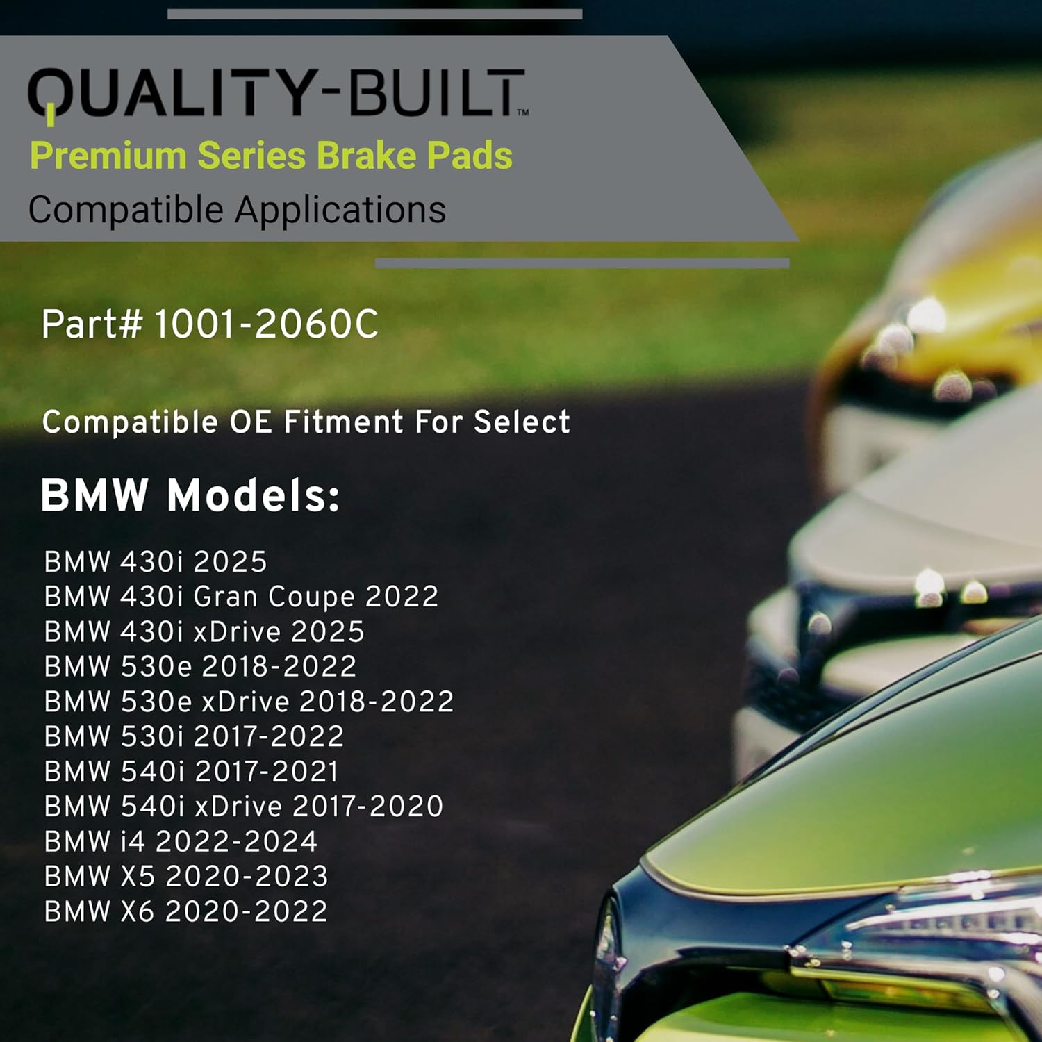- VEHICLE FITMENT LIST: BMW 430i 2025, 430i Gran Coupe 2022, 430i xDrive 2025, 530e 2022-2018, 530e xDrive 2022-2018, 530i 2022-2017, 540i 2021-2017, 540i xDrive 2020-2017, i4 2024-2022, X5 2023-2020, X6 2022-2020 (PART#1001-2060C)