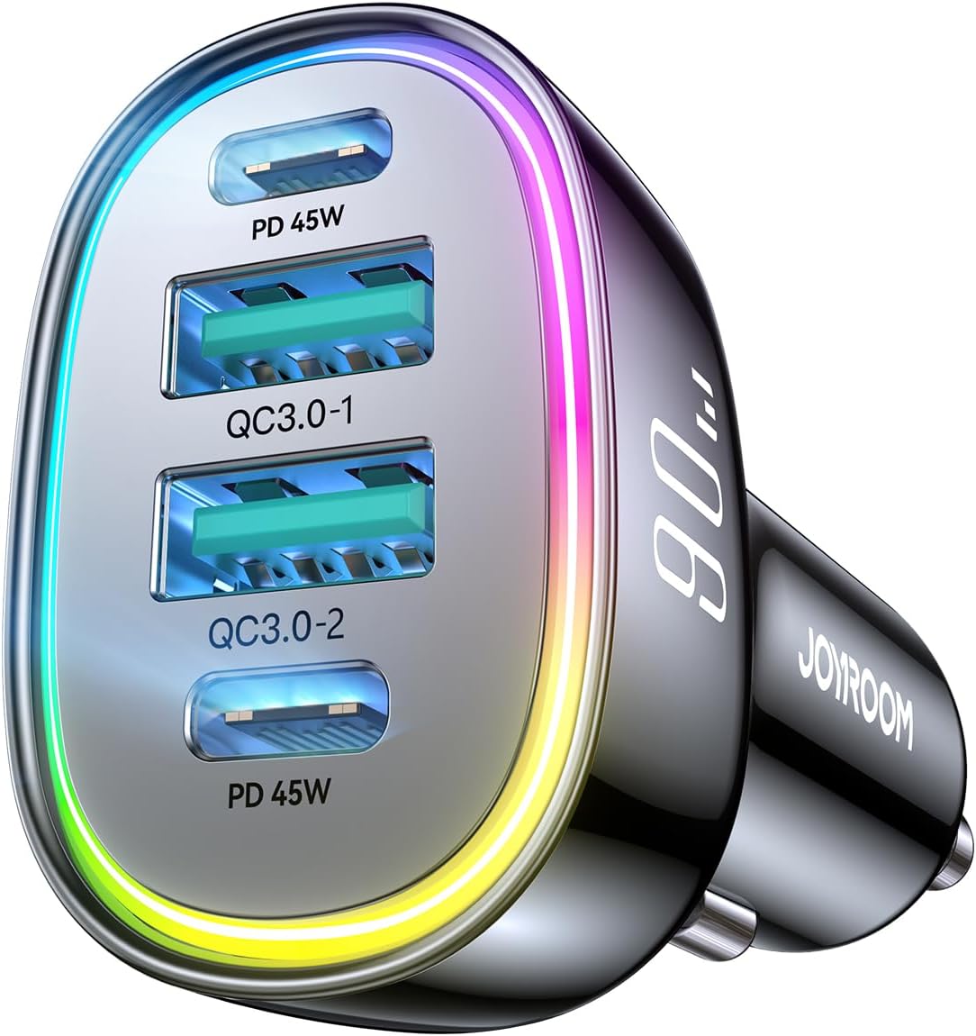 - 90W Super Fast Car Charger - JOYROOM car charger usb c is equipped with dual PD45W+ PD45W USB-C ports and dual USB-A ports to support PD/QC3.0/PPS super fast charging. The iPhone 16 Car Charger charges your iPhone 15/16 Pro Max and Samsung Galaxy S25/S24Ultra from 0% to 85% in 30 minutes, reducing charging time by 60%