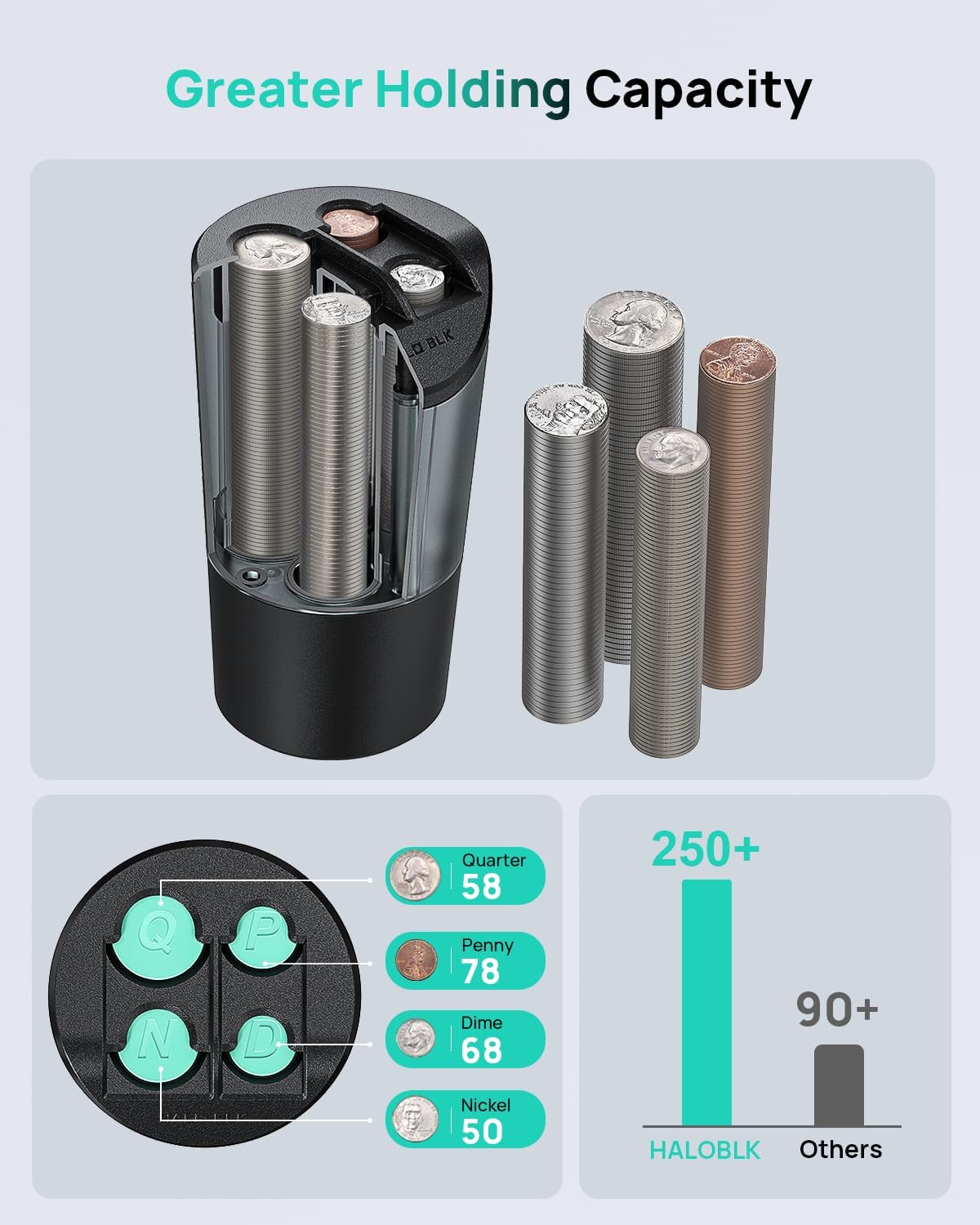- Larger Capacity: Holds over 250 coins, including 58 quarters, 68 dimes, 50 nickels, and 78 pennies.