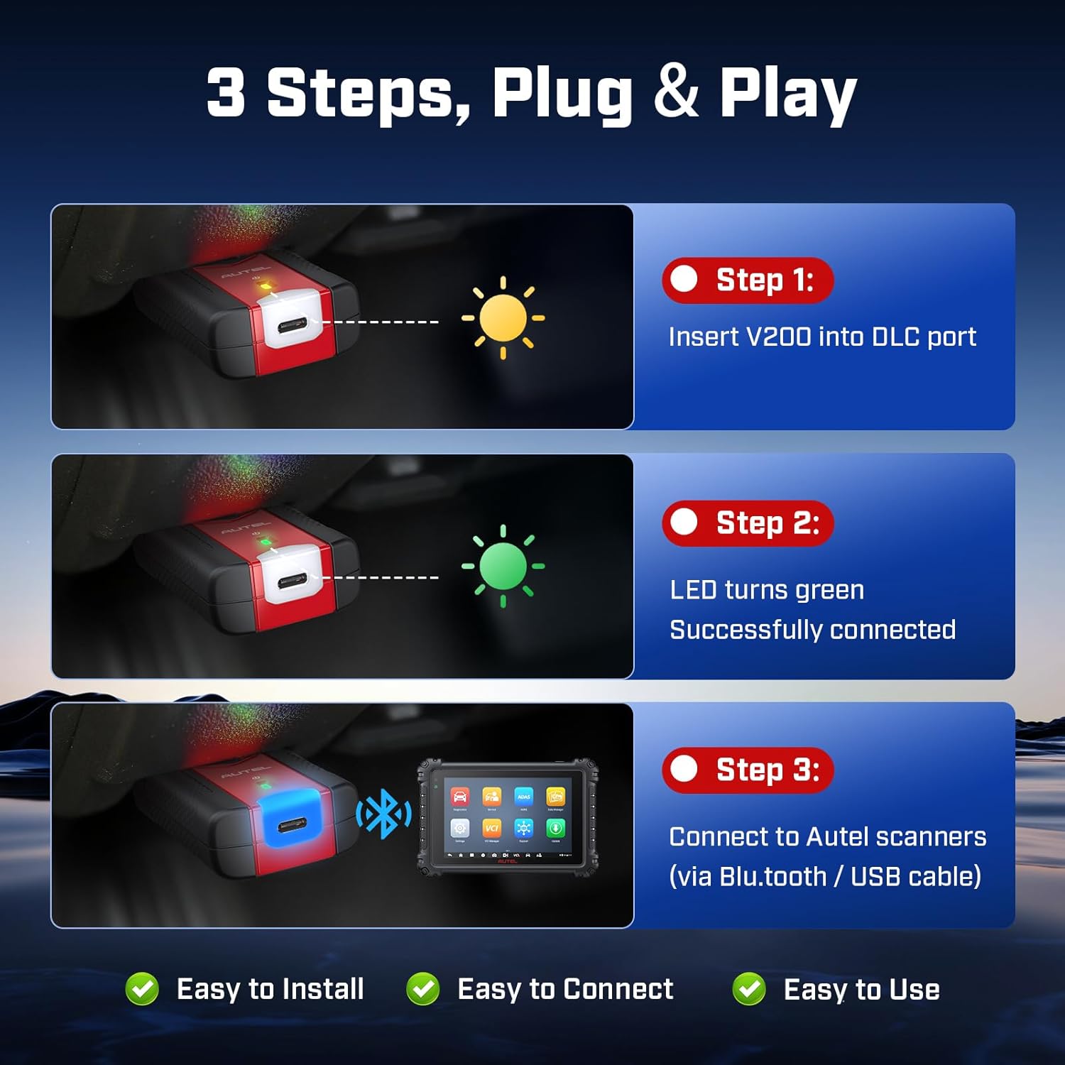 - ♻️【How to Connect V200】For Non-OBDII Vehicles: plug OBDI adapter’s 16-PIN jack into VCI200’s “Vehicle Data Connector”, then connect the attached OBDI adapter to DLC port >> For Standard OBDII Vehicles: directly plug Autel MaxiVCI V200 into the car’s OBD-II port (usually under the dashboard) >> Auto-Sync Warm Tips: your Autel tablet and V200 will automatically pair on first use, no manual setup needed. Need Help? Message us if you have any issues with the V200.