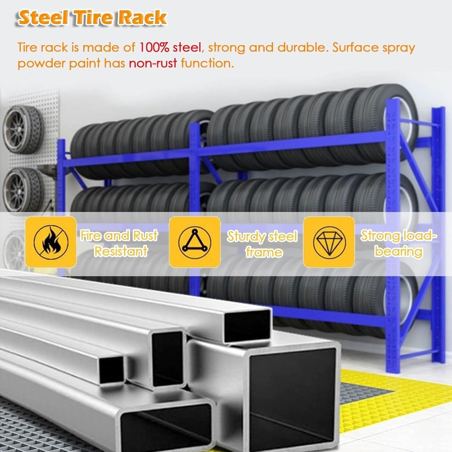 - STEEL TIRE STORAGE RACK: Constructed from cold-rolled steel with wear resistant. No sharp edges to prevent scratches on the tire. Load-bearing: 500kg/1102lb.