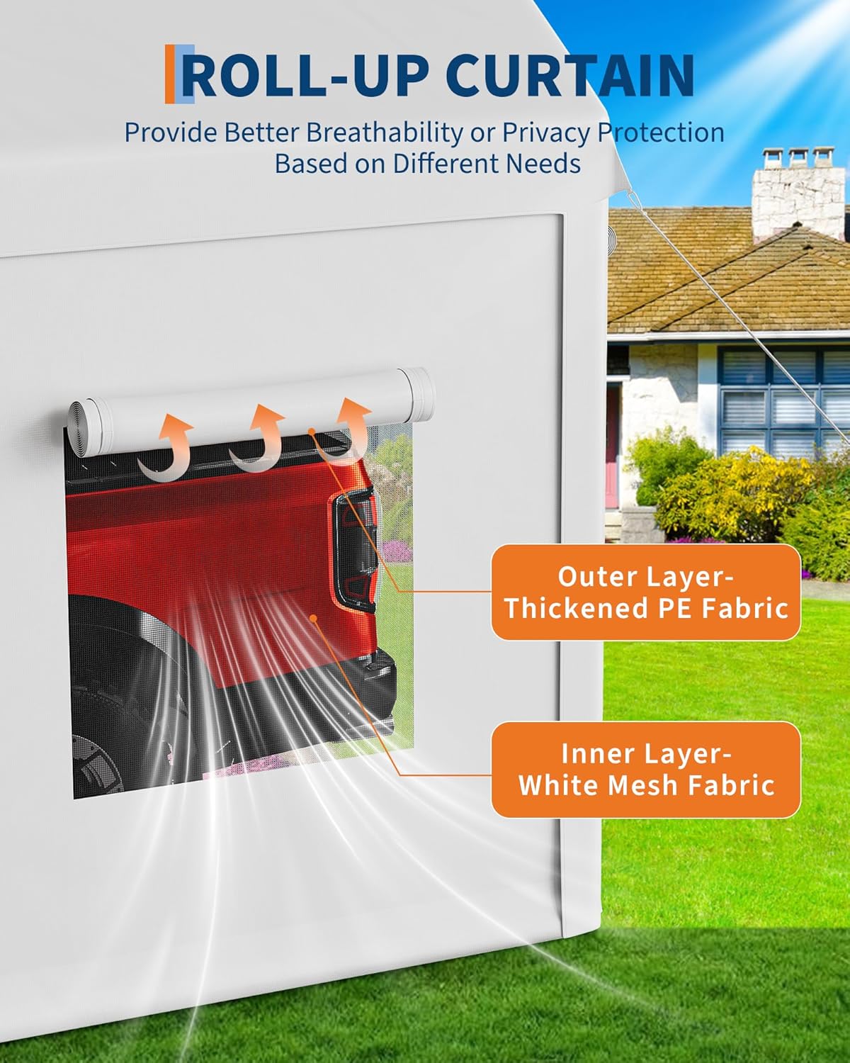 - Ventilated Design with Roll-Up Doors & Windows: Roll-up windows and doors improve airflow for heat control and easy access to parked vehicles. Flexible use: open for ventilation in summer or closed for full protection in rain/snow.
